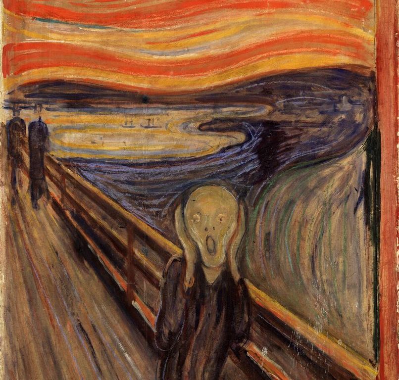 A obra representa uma figura andrógina num momento de profunda angústia e desespero existencial. O plano de fundo é a doca de Oslofjord (em Oslo) ao pôr-do-Sol.