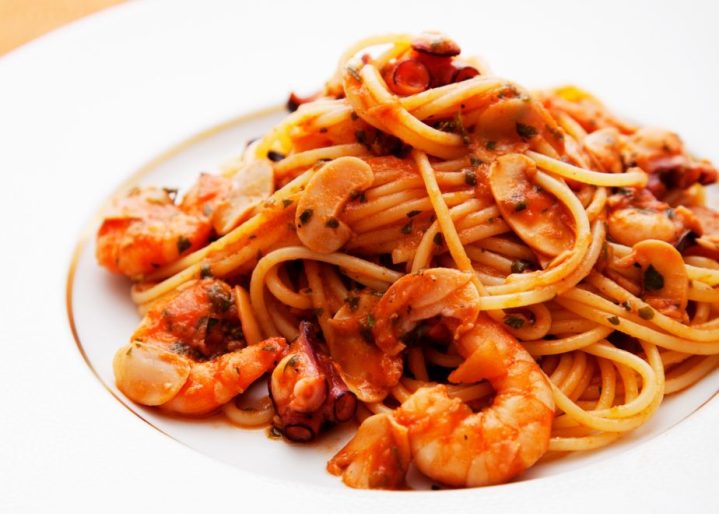 Spaghetti – O spaghetti pode ser servido com uma variedade de molhos, o mais comum é com molho de tomate com queijo ralado e folhas de manjericão.