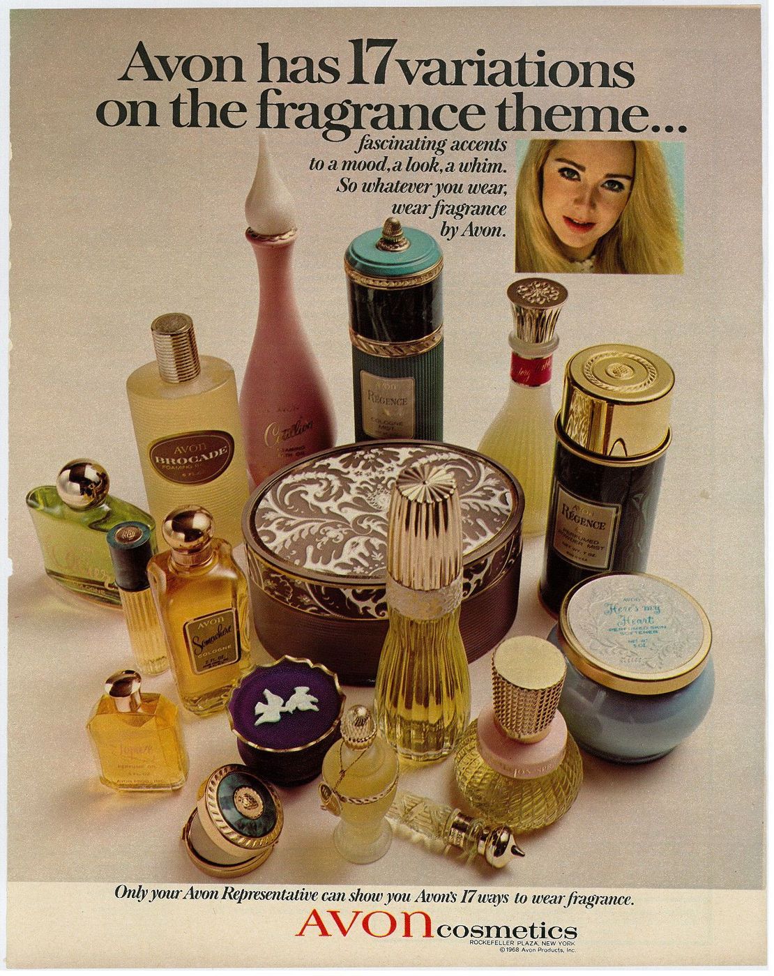 1960 – Os Beatles e os Rolling Stones embalavam o Pop Rock dos anos 60. Época da minissaia e auge da modelo Twiggy, musa da extrema magreza. As grandes mudanças de comportamento eram marcadas por fragrâncias que evocavam a liberdade. Avon lança seu primeiro perfume ‘Unforgettable’.