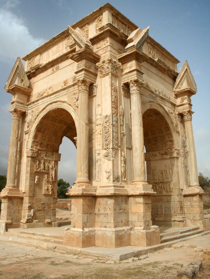 Arco de Sétimo Severo (Líbia – 203 d.C.) – De todos os arcos do triunfo que sobreviveram da Roma Antiga, o arco de Sétimo Severo na Líbia é o maior. Com seus impressionantes 23 metros de altura, o arco celebra as vitórias de Sétimo Severo sobre os partas em 194-195. O imperador havia nascido em Leptis Magna, e foi responsável por um grande programa de construções nessa cidade e na própria capital, Roma. Esse arco se destaca por ser um Tetrápilo, ou seja, um arco de forma cúbica com um portão em cada um dos quatro lados.