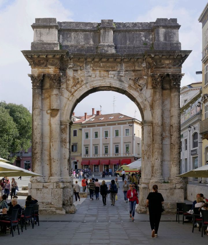 Arco dos Sérgios (Pula, Croácia – 27 a.C.) – Pula é uma cidade da costa da atual Croácia, que conta com diversas construções da época romana, inclusive a Arena de Pula, um dos maiores anfiteatros da antiguidade. O arco do triunfo de Pula celebrava três membros que lutaram na 19° legião na batalha naval de Áccio.