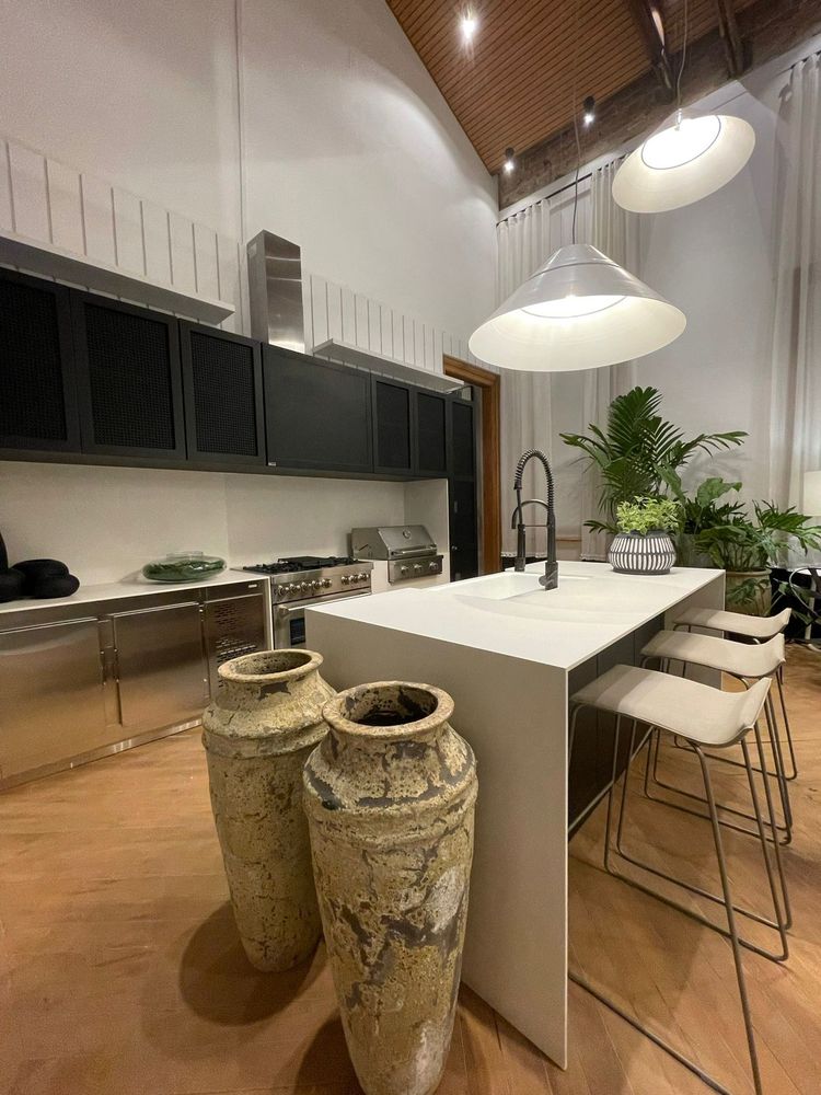 Entre as novidades, a palha artesanal – usada antigamente como empalhamento para cadeiras – ganhou a cor preta e foi utilizada nas grandes portas sem emendas na cozinha.