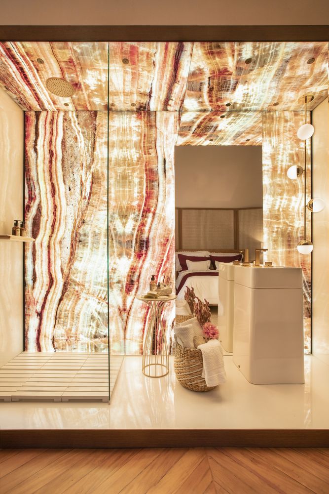 Ocupando uma área 60 m² com pé direito de 4,30 m, o ambiente traz como principal lançamento o Corstone da Weiku do Brasil, material de vidro laminado que permite representar pedras exóticas e retro iluminadas. O produto foi utilizado como uma parede que divide o banho e o living.