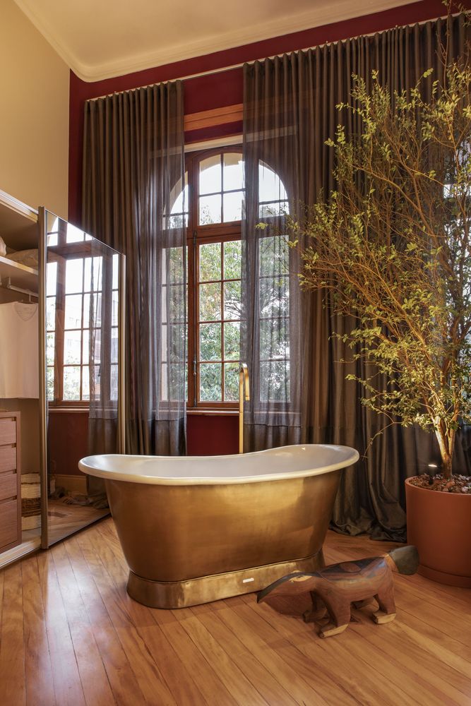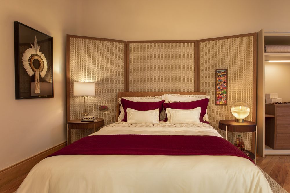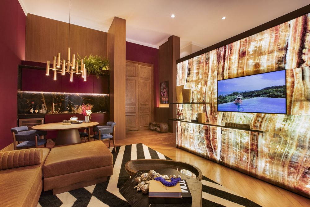 Para o projeto o designer optou pelas cores Bordo e Luar, ambas da Suvinil, e apostou em materiais como pedras exóticas, como a Bellatrix, um granito nacional tipo exportação, além de couro, linho, texturas naturais e MDF de alto padrão da GreenPlac. A iluminação possui detalhes em latão e capim dourado, elementos distintos que trazem o glamour e o chame às peças.