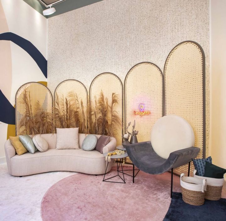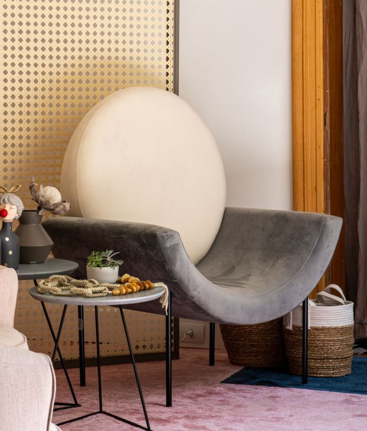O uso do revestimento cimentício em formato de tijolinho, que imita granilite Gauss, faz a composição com os biombos de palhinha desenhados pelas designers, criando uma memória afetiva.
