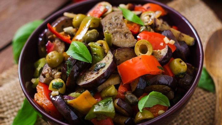 Colocar um fio de azeite em uma panela e refogar a cebola e o alho. Depois adicionar os pimentões e, quando estiverem macios, adicionar a berinjela. Quando estiver macio, adicionar o orégano, o vinagre branco e o azeite e depois temperar com sal e pimenta a gosto.