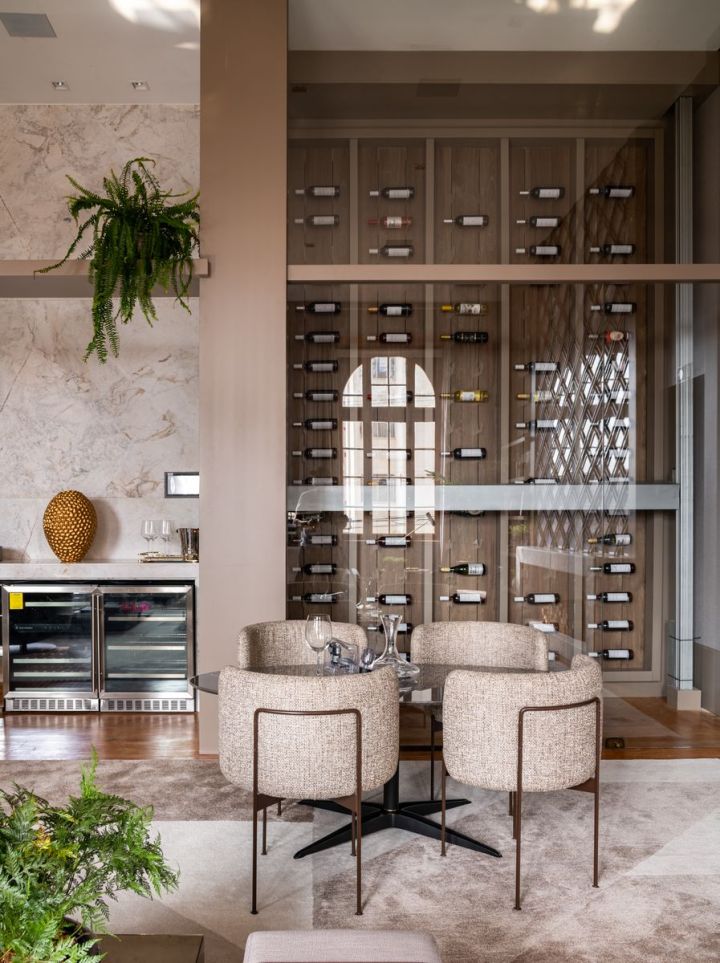 O destaque do living de 58 m² e pé direito de 4.20 m é a impressionante adega, que utiliza o espaço através da sua verticalização e conta com a ajuda de um robô para coletar os vinhos e entregá-los ao degustador.