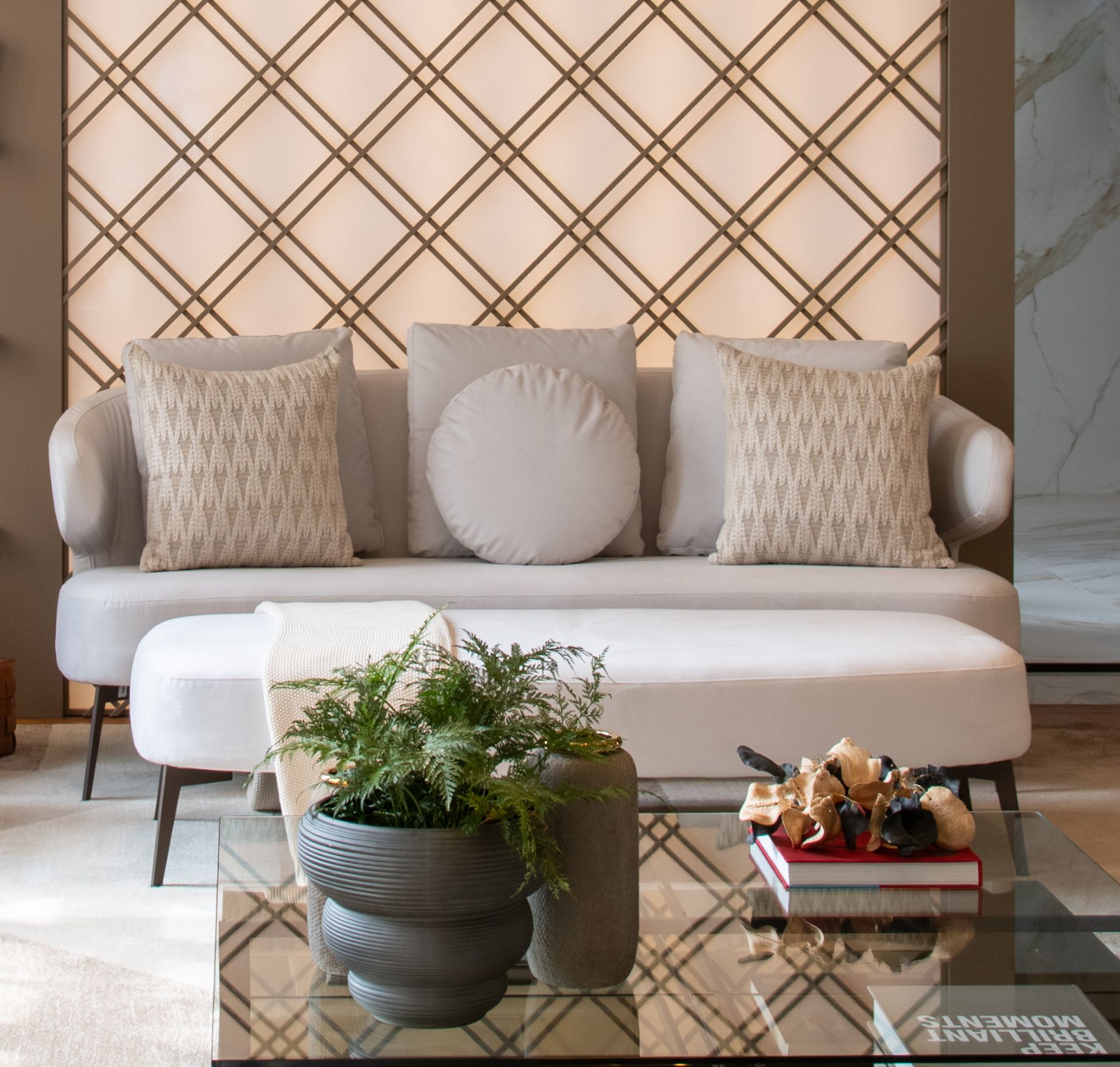 O mármore Bianco Gris, um dos mármores nacionais mais bonitos, completa a sofisticação. Já o paisagismo está concentrado em dois grandes vasos nas laterais do sofá com a Palmeira Chamaedorea.
