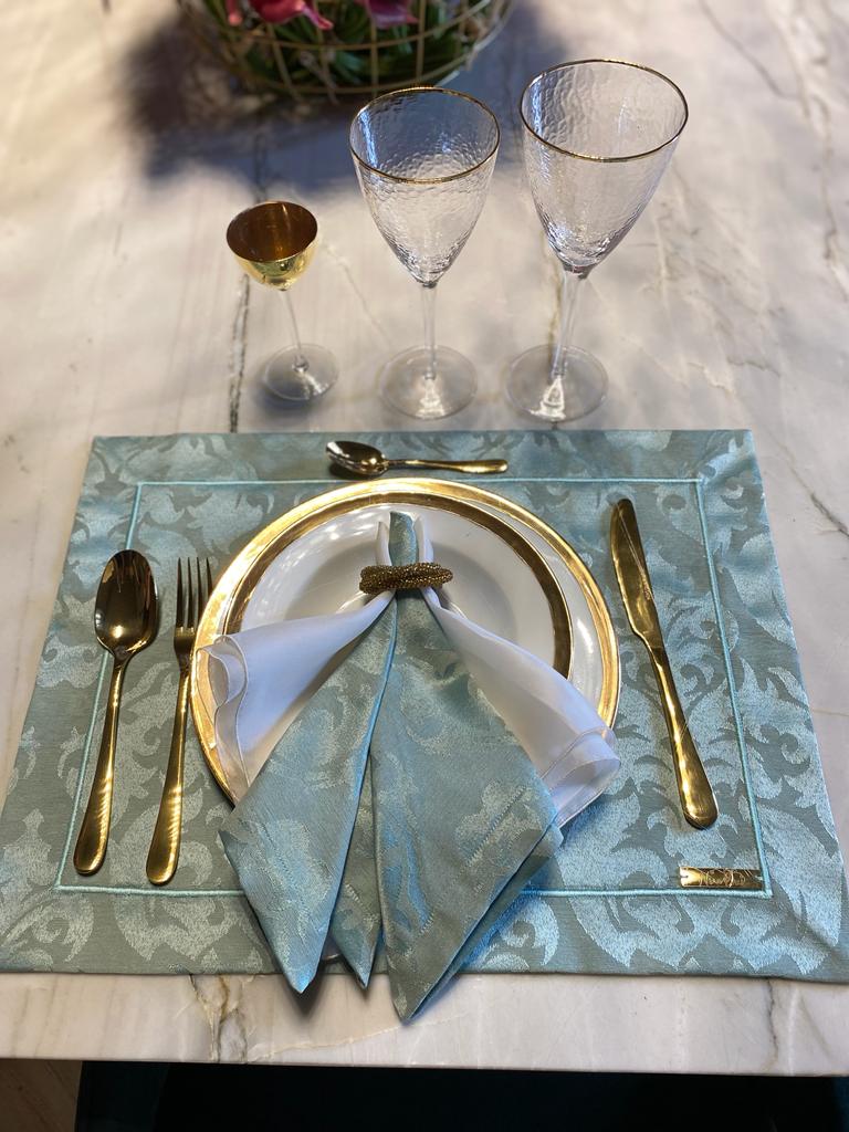 O Jantar em Paris utiliza predominantemente materiais como pedra natural, pendente de cristal egípcio, vidro colorido, serralheria, vegetação natural, cortina em linho, madeira, MDF e latão.