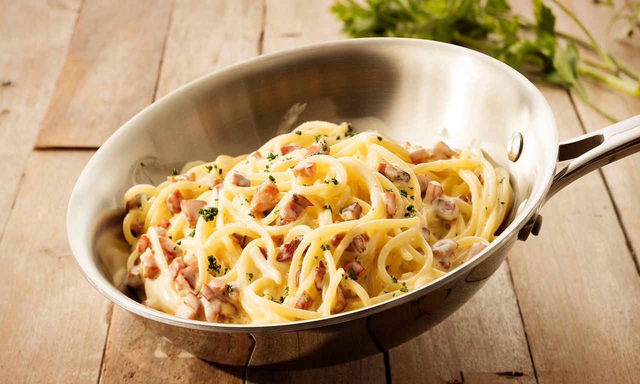 O tradicional carbonara é preparado com pancetta, corte suíno que tem sabor marcante e faz toda a diferença no prato. Seguindo a tradição, o Abbraccio serve o seu Carbonara di Roma com pancetta e molho de parmesão à base de ovos, servido com Spaghetti.