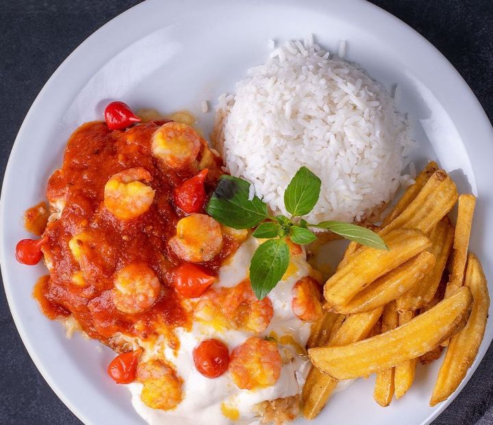 - BAR DO BIGODI E TIA ELI – Tilápia a Parmegiana – Tilápia a parmegiana coberta com camarão ao molho misto ou molho ao sugo. Acompanha batata rústica temperada com ervas e arroz;