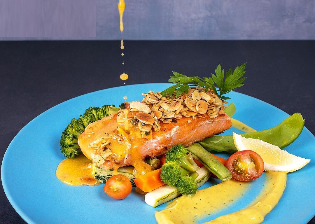 - SEO ROSA Gramado – Salmão Terra Mares – Salmão em crosta de amêndoas e castanhas regado com molho de maracujá, bionese de abacate e legumes grelhados.