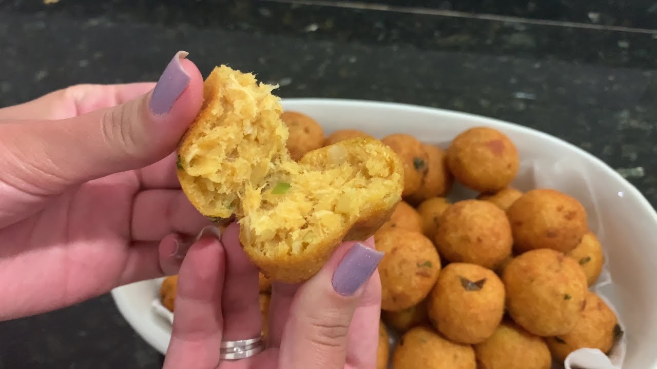 Pegue um pouco do purê e faça um pequeno disco. Recheie com frango e feche em formato de bolinha.