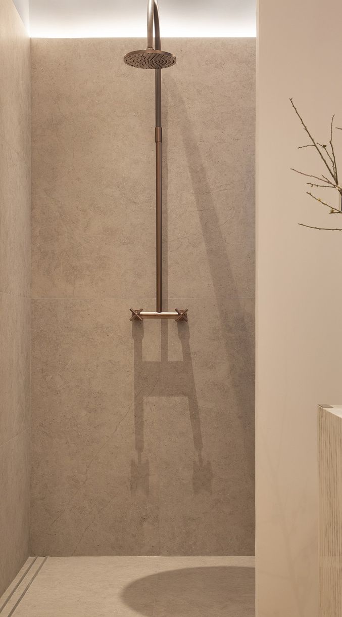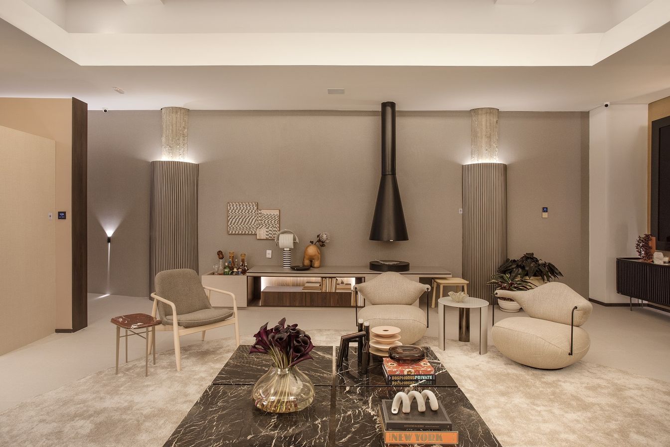 Lâminas sintetizadas somam-se às lastras de grande formato da coleção Recital, no formato 160x320cm, da Portinari, e trazem um toque de suavidade para os revestimentos que se estendem da parede ao mobiliário.