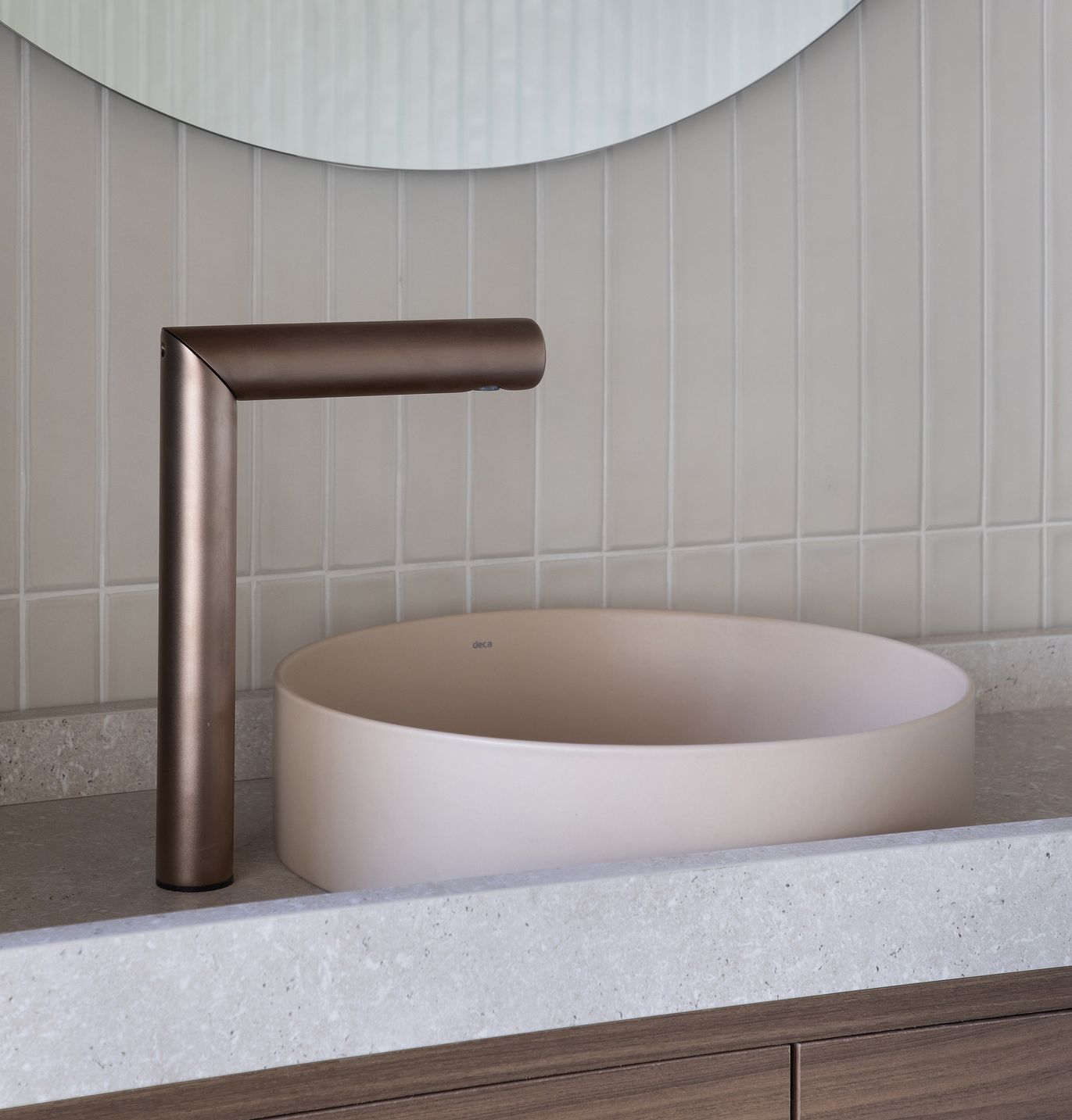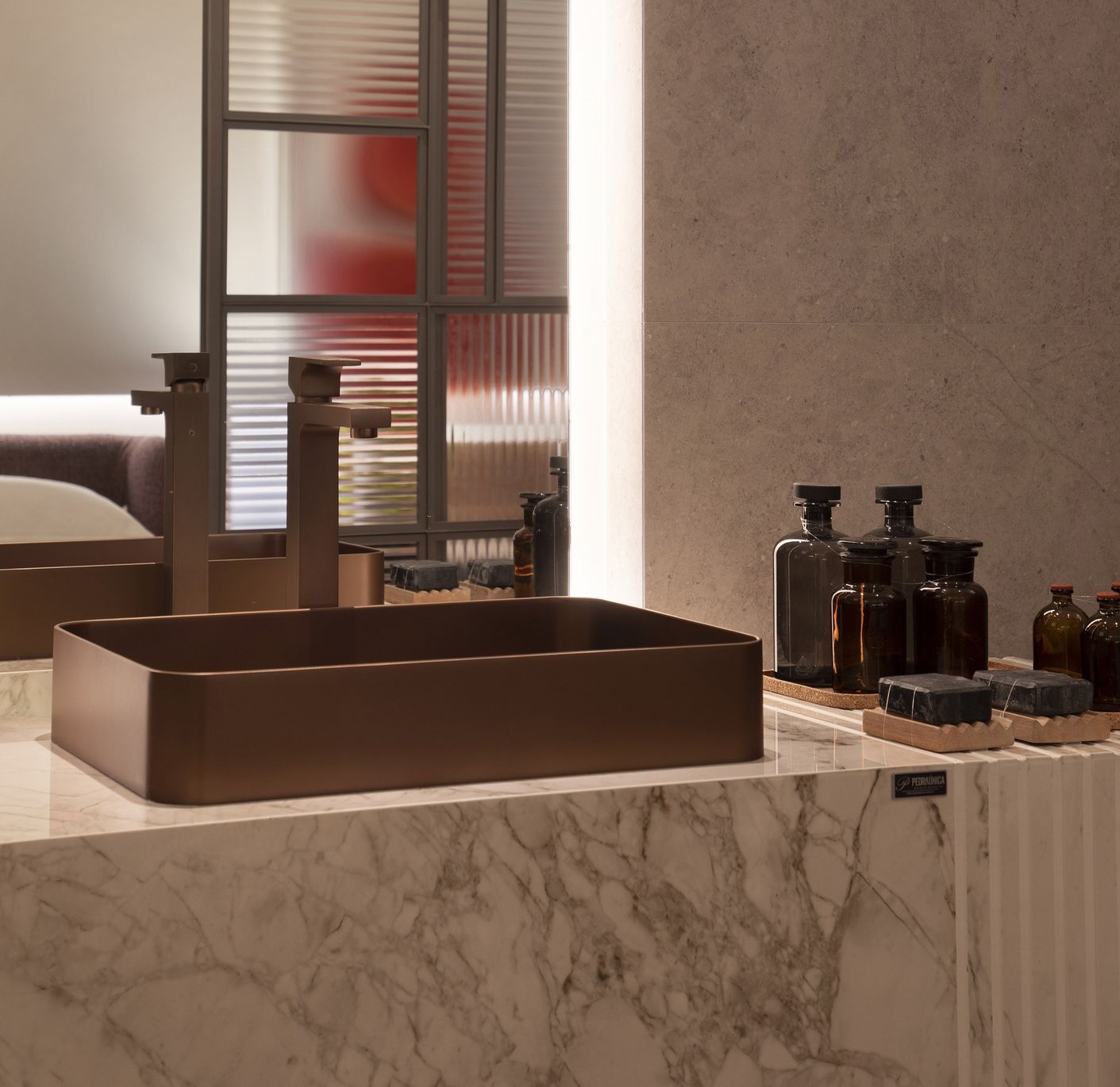 A bancada em porcelanato Travertino Senses, em formato de bandeja, abraça o conjunto de louças e metais Deca. Essa composição dialoga com a proposta em cores e formatos terrosos, amadeirados e singulares. A cuba de sobrepor redonda, na cor marfim, acompanha as rotinas de higiene com acabamento suave, e a Torneira de mesa bica alta para lavatório Orion, com assinatura de Ricardo Bello Dias, na tonalidade Corten, se soma ao espaço, como elemento de design funcional e singular.