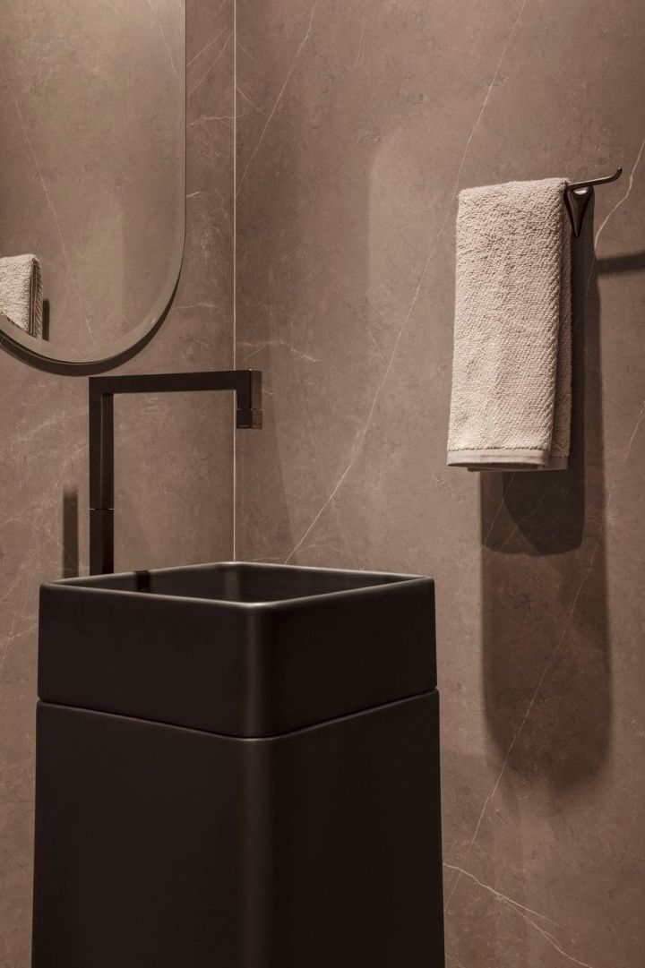 A dupla de arquitetos buscou inspiração na vida noturna paulistana para criar um estúdio com tons de cinza. A estética segue um design marcado com metais em Black Matte e louças em Ébano Fosco. A Cuba de piso quadrada e a Torneira curva de piso Tube se destacam na composição com a Bacia Convencional Piano. A paleta intensa e profunda do revestimento Portinari Audaz BK reforça a proposta, com tons escuros da textura naturalmente desgastada da pedra.