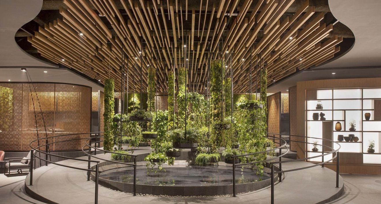 No Senses Hall Deca, projeto assinado pelo arquiteto Roberto Migotto. Com 530m², o espaço traz uma paleta de cores sóbrias com ares asiáticos. A escolha de materiais passeia livre pelas muitas texturas de revestimentos e divisórias, produzidas com o padrão Freijó Puro, que remete ao freijó, madeira brasileira natural da região Amazônica, que apresenta tonalidade amendoada e toques de dourado nas catedrais.