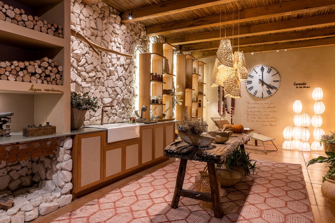 Inspirada pela simplicidade do campo, a arquiteta Helô Marques, assina o atelier botânico denominado Carandá. Com 72m², o espaço traz inúmeras referências e elementos telúricos como terra, madeira de demolição, mármores e a madeira natural representada pelo padrão Cumaru Raiz, que reveste o mobiliário da área gourmet. Com tonalidade mel queimado, seus poros têm características únicas e veios com um movimento orgânico delicado diferente das estruturas mais tradicionais de madeira.