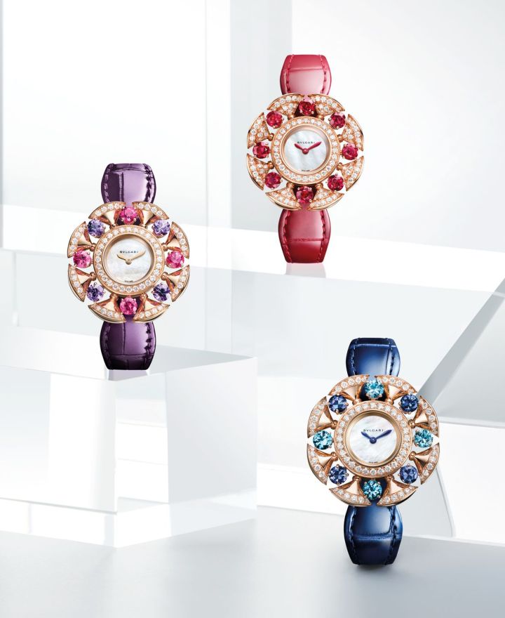 Pétalas móveis preciosas flutuam ao redor da face perolada do Divas’ Dream, impelidas pelos movimentos dos pulsos. Sua forma é uma reminiscência da folha de ginkgo, simbolizando a união de opostos. Neste modelo, a Bulgari combina a dureza das pedras com a fluidez das pétalas ventiladas de topázios, tanzanitas, ametistas, turmalinas, rubis e diamantes.