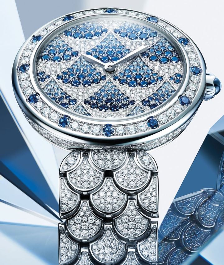 A Divas’ Dream Mosaica com safiras azuis é emparelhada com uma pulseira espetacular criada pelos ourives da Bulgari. Como tantas estrelas brilhantes, cada um dos elos em forma de leque brilha com uma profusão de diamantes. O fundo de caixa transparente revela um movimento mecânico de corda automática finamente decorado da Bulgari Watch Manufacture in Switzerland.