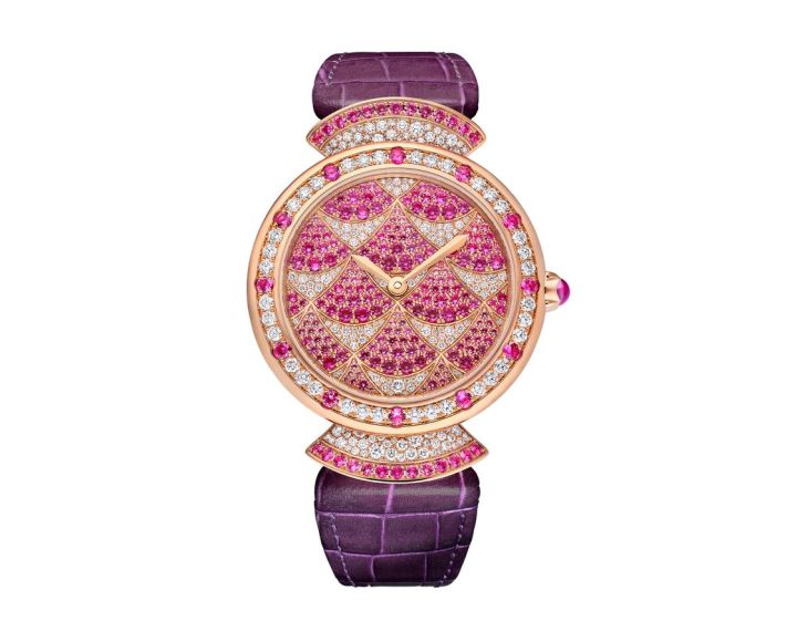Com tons de azul no primeiro modelo e malva no segundo, a beleza do ouro rosa polido na base das pétalas combina com o brilho dos diamantes. No terceiro, oito rubis vermelhos profundos – uma cor simbólica de boa sorte e fortuna na cultura asiática durante as festividades do Ano Novo Chinês – contrastam com um padrão de revestimento de diamante. Pulseira de couro de jacaré.