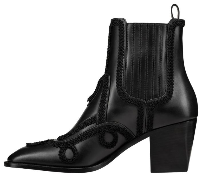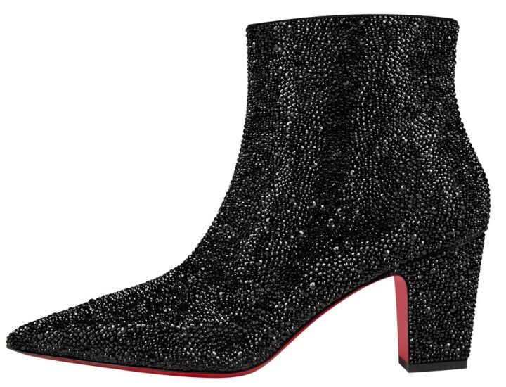 Assumidamente rock’n’roll com seu salto cubano de 8 cm, a bota Aiglissima possui um bico fino e pontudo e vem coberta de strass preto.