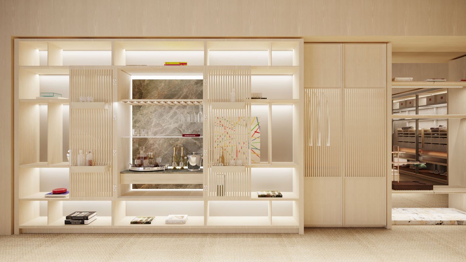 As estruturas em madeira maciça ventilada – certificada internacionalmente pelo FSC® – Forest Stewardship Council® (Conselho de Manejo Florestal) – produzem um efeito de luz e sombra, formando desenhos arquitetônicos e criando cubos de luz que enobrecem os espaços residenciais. Além disso, os vidros têm forte presença nos gaveteiros e ilhas, criando caixas iluminadas que geram efeitos sensoriais, reforçando o prazer de bem-estar. O couro também se destaca na nova coleção, enobrecendo as formas orgânicas e trazendo conforto.