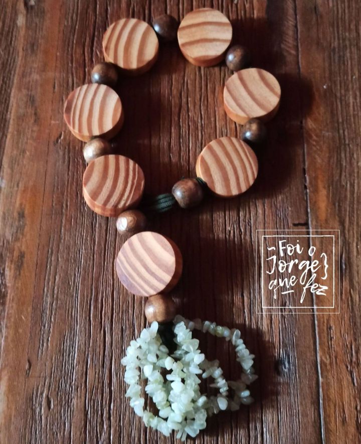 Depois de tratadas, as peças são transformadas em colares, brincos e pulseiras combinadas com Vegan Suede, Borracha Anel O’Ring, Pedras Naturais, Murano, Cristais, Pérolas Acrílicas, Abalone, ABS ou Acrílico.