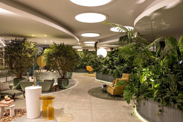 O espaço de 420m2 traz a biofilia brasileira e a estética acolhedora de revestimentos das marcas Portinari e Ceusa, além de piso Castelatto em tons de verde, como cenário que abraça a temporalidade e promove experiências sensoriais movidas por ações cíclicas. Dia e noite são representados pelas transições de iluminação e sonorização, e despertarão bem-estar, como um convite a reflexão sobre a importância da integração da natureza com o design e a funcionalidade nas moradias.