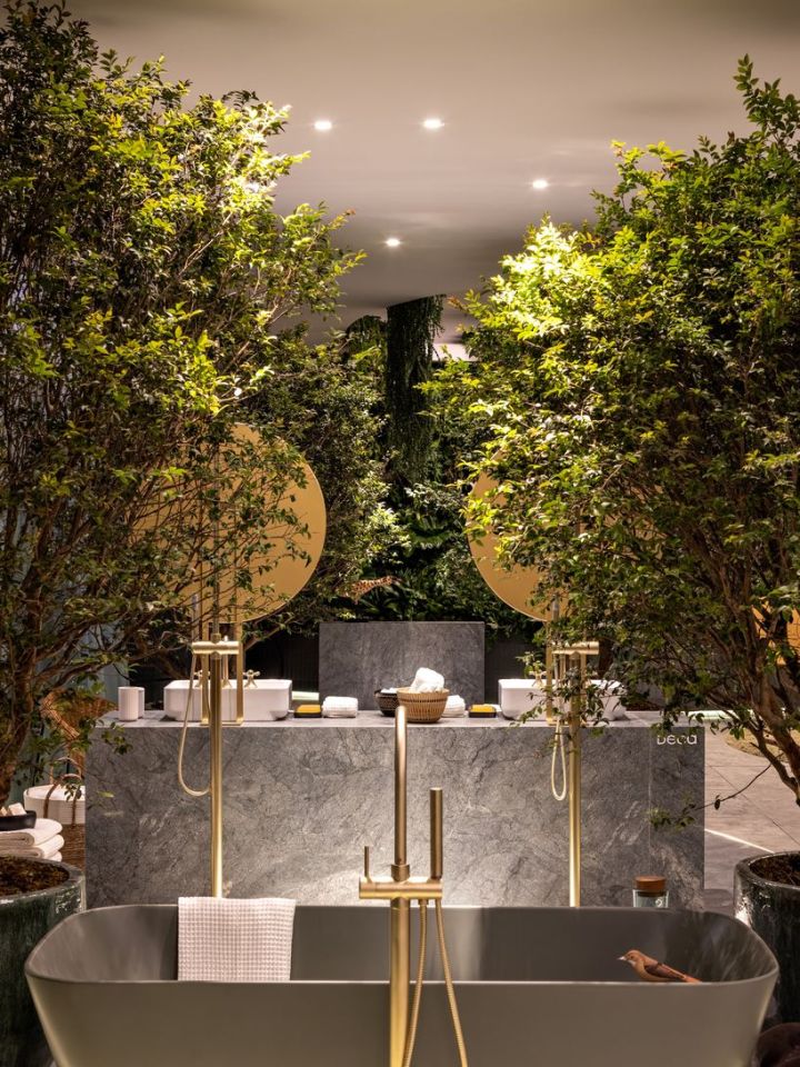 Ao centro, um amplo espelho d’agua concentra a singularidade dos metais Deca em cascatas. Na nova paleta de cores D.Coat, eles reforçam a estratégia da marca em promover uma transformação na categoria através da ampla variedade de cores em acabamentos de alta performance. Bicas em formato Wave – curvo e alongado, se misturam ao verde do espaço.