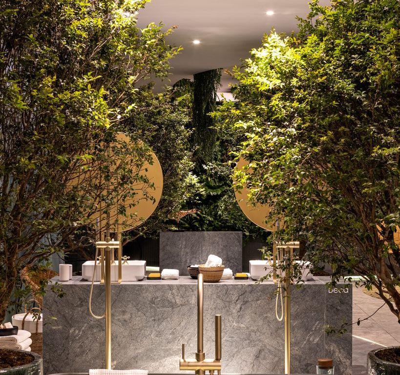 Ao centro, um amplo espelho d’agua concentra a singularidade dos metais Deca em cascatas. Na nova paleta de cores D.Coat, eles reforçam a estratégia da marca em promover uma transformação na categoria através da ampla variedade de cores em acabamentos de alta performance. Bicas em formato Wave – curvo e alongado, se misturam ao verde do espaço.