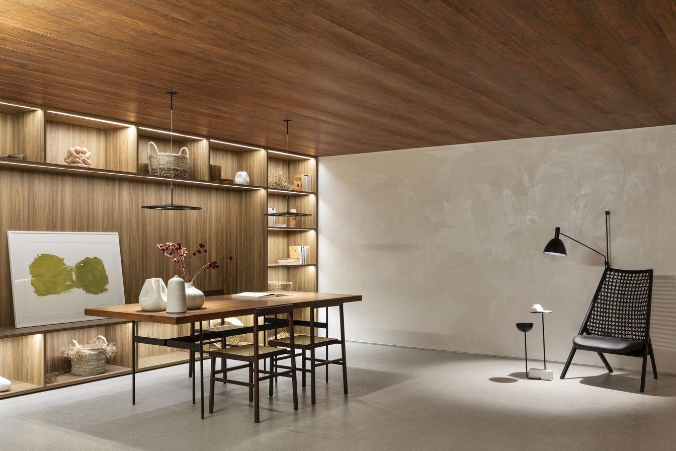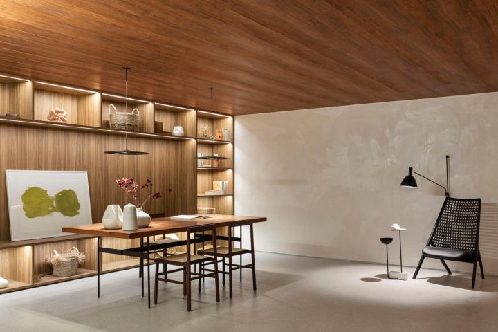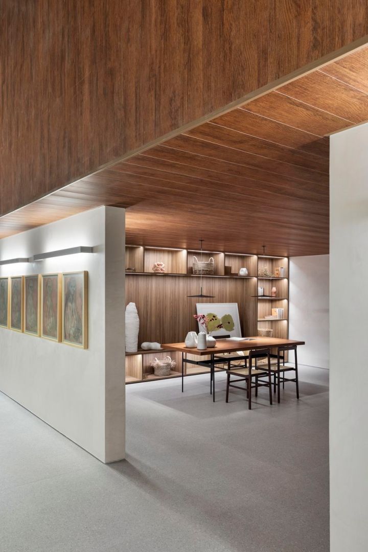 O projeto é assinado por Gabriel de Lucca, arquiteto à frente do escritório GDL Arquitetura. Com 192m², a galeria possui predominância da madeira e do concreto em perfeito diálogo com o edifício.