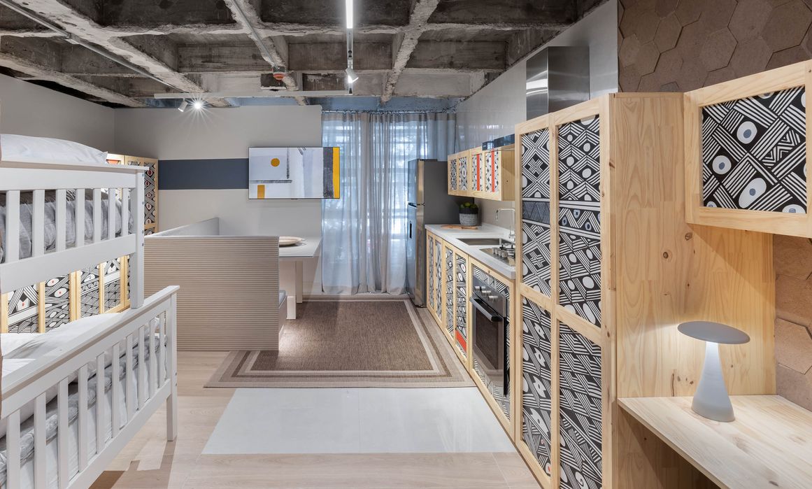 O ambiente de 34m² abriga um quarto, banheiro, lavanderia e cozinha integrados. A arquiteta explica que o projeto não foi concebido apenas para ser admirado, mas para promover o diálogo e inspirar os moradores do Jardim Colombo a explorarem novas possibilidades de moradia.