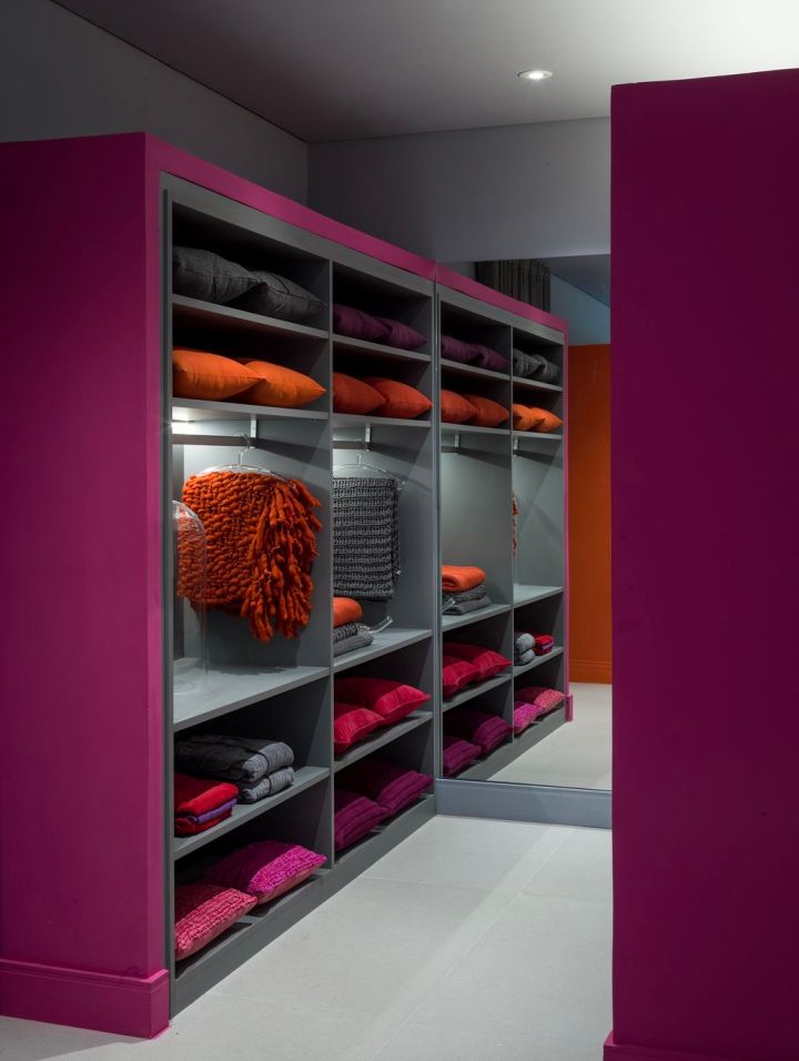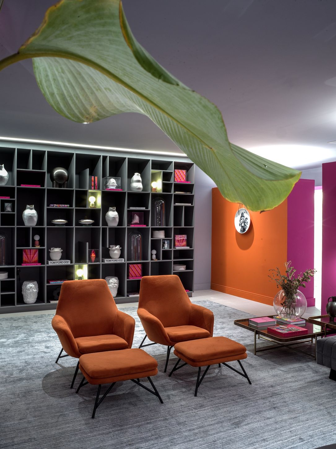 Ao entrar no ambiente, destaque para o sofá de veludo cinza e as poltronas em tecido laranja da Delumini. A estante criada pela própria arquiteta apresenta formas modernas com suas chapas em MDF Cinza Sagrado, fornecidas pela Duratex e confeccionada pela Decorakasa (Mestre Marceneiro) em parceria com Romanzza Moema. Luminárias da La Lampe iluminam os nichos. Para complementar, papelaria artesanal da By Gabs, da galeria MK, vasos da 6F e Sui Objetos.