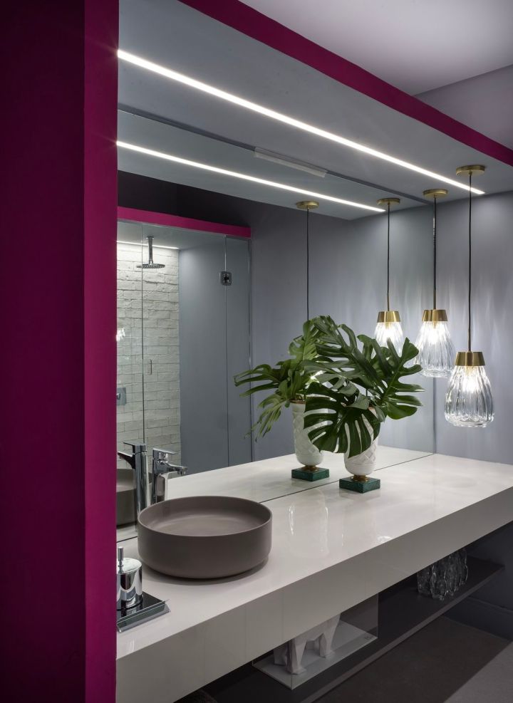 O banheiro conta com espelho cristal e box de vidro temperado, executados Penha vidros e fornecidos pela Cebrace. Já bancada em pedra Rio Branco da Cosentino, louças e metais da Deca e pendentes em cristal da La Lampe.