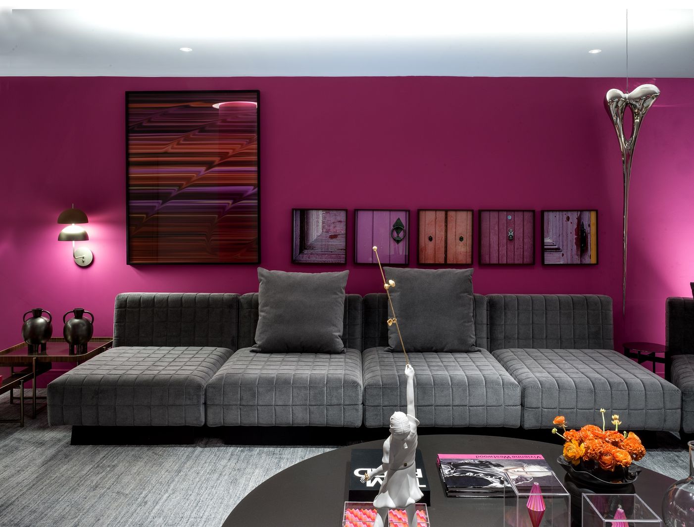 Ainda no living, uma obra de arte de Adrianna Eu, na qual a artista usa latão fundido com banho de cromo em forma de agulha. Além dos cristais de Cris Bevilacqua: a casa e seu morador, uma relação de amor.