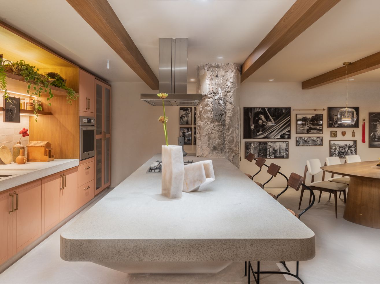 Os brises, além de controlar a entrada de luminosidade e a privacidade, permitem que quem esteja de fora tenha uma ideia do que irá encontrar nos 68 m² destinados a cozinha e sala de jantar e 12 m² para a cozinha de apoio, que fica na parte de trás do ambiente. Um dos destaques foi a bancada de pedra que lembra o formato de um navio feita com granito Itaúnas.