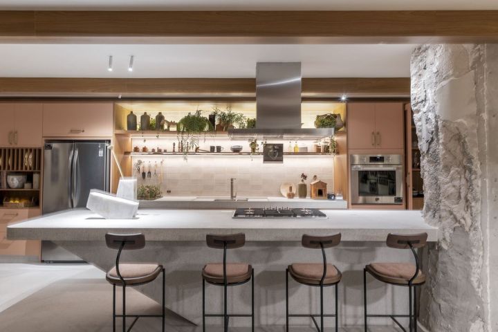 O escritório Figueiredo & Fischer Arquitetos projetou para Casa Líder uma atmosfera de bem-estar, com decoração de caráter rústico. O espaço exibe paredes com acabamento feito de terra, piso de cacos de granito, além de painéis e forro de madeira. Na cozinha, metais em tom Corten potencializam o conceito com o Monocomando Deca You Click e Acionamento Flat. Já a Cuba tripla Wish, em Inox, se soma a soluções pensadas para um design funcional.