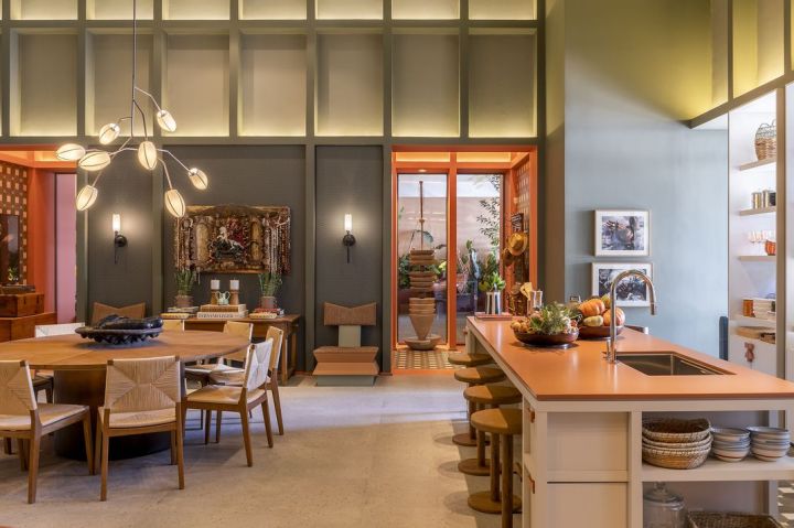 A ampla e convidativa cozinha ressalta a beleza da composição com outros materiais, como revestimentos Portinari e os metais Deca, como a Cuba de cozinha Wish e o Misturador Monocomando de mesa Deca Urban Inox – um dos lançamentos 2023 -, que traz um design pensado para funcionalidade, somado a atributos estéticos que tornam o uso mais intuitivo.