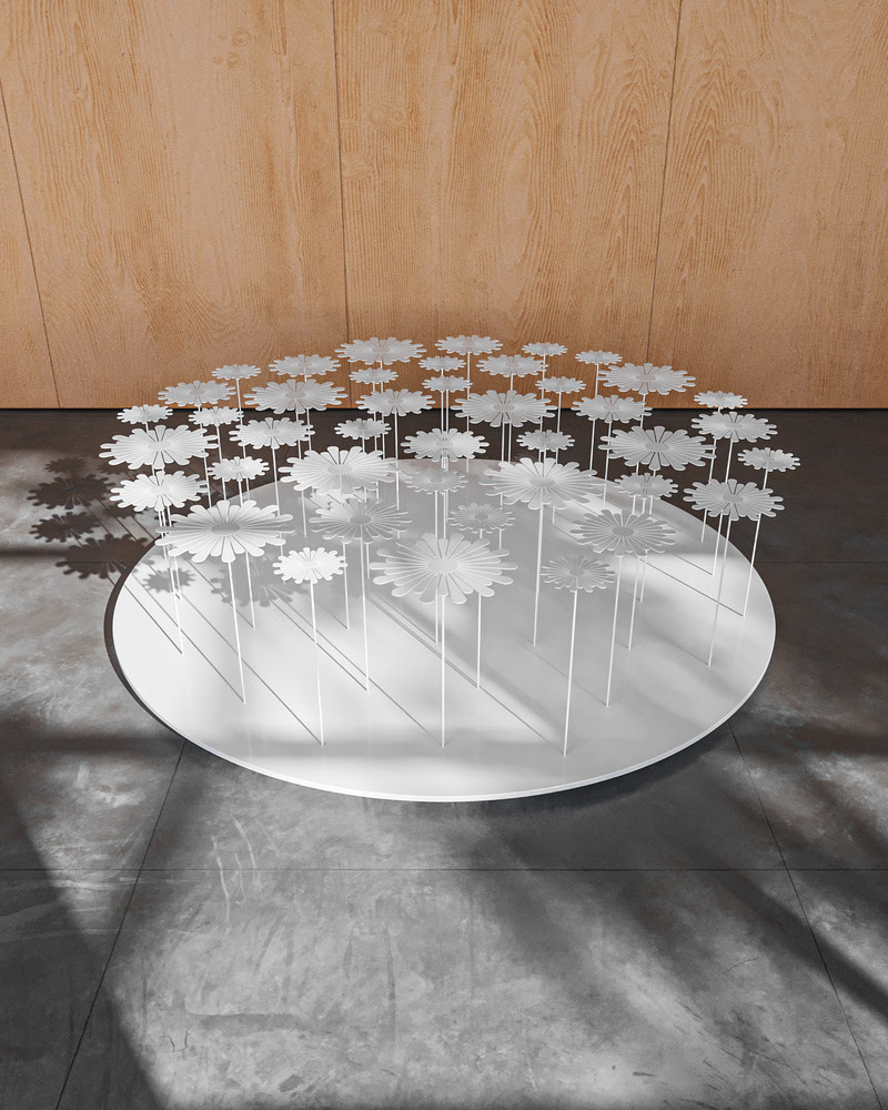Outra peça, Le Jardin, tem um metro de diâmetro com hastes e flores sobre uma base minimalista. Revestida com uma pintura especial perolizada branca.