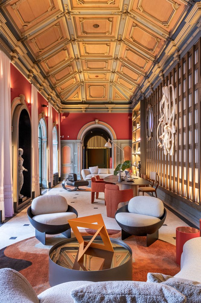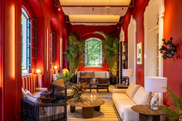 Dois ambientes chamam atenção pelo uso do vermelho. A Recepção, de Lenora Lohrisch e Wair de Paula, ganhou a ousadia do tom Terra Forte, um vermelho quase ocre que deu ainda mais destaque ao teto original do espaço (que já pertenceu a uma igreja) e deixou brilhar a escultura de Krajcberg na parede. No Jardim de Inverno, de Erick Figueira de Mello, a cor vem mais aberta trazendo ares bem orientais para o ambiente.
