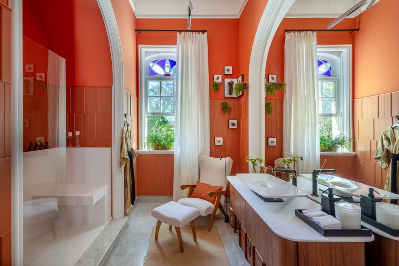 O terracota aparece na Suíte Tu Vens, de Paula Muller. A arquiteta revestiu o banheiro com cerâmica no tom e ainda reproduziu a mesma cor da fachada, a Terra de Fogo, nas paredes.