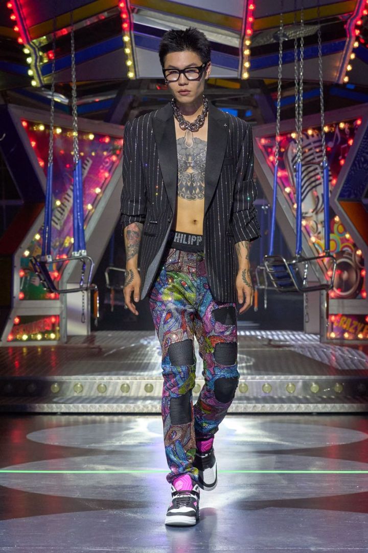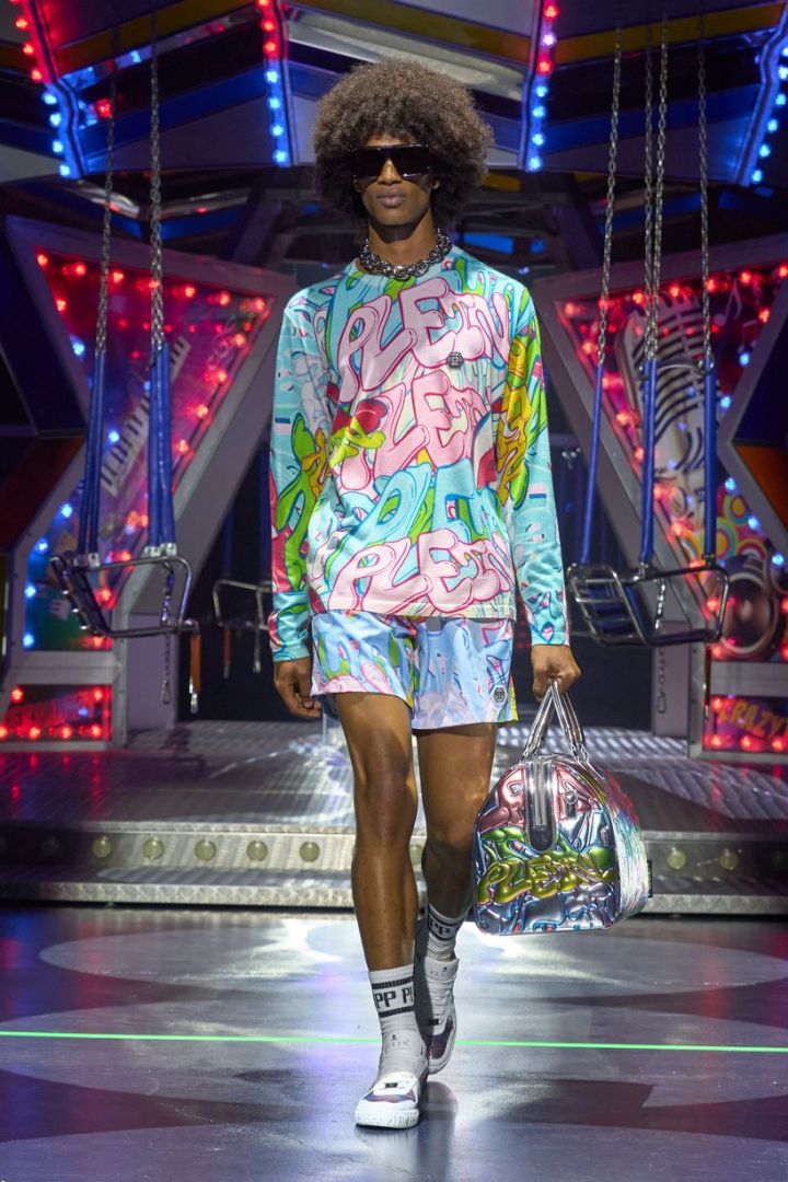A marca Philipp Plein apresentou sua coleção Summer 2024 na Semana de Moda de Milão com forte pegada do underground dos anos 80.