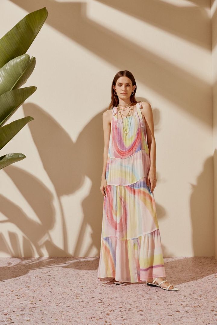 A estampa foi aplicada em tecidos como seda, tricoline e viscose, resultando em uma regata pintada à mão, vestido fluido de alças, e conjunto de calça e camisa de tricoline.