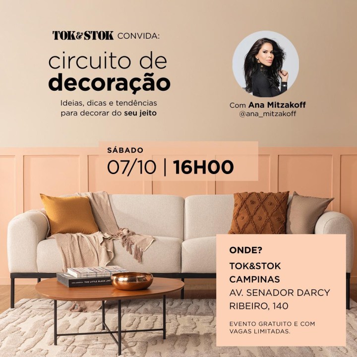 A Tok&Stok recebe a designer de interiores Ana Mitzakoff no sábado, 07 de outubro, às 16h. A querida irá ministrar um workshop sobre as tendências, propostas e ideias de ambientação usando os produtos da loja.