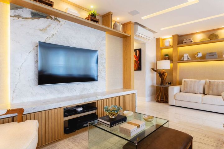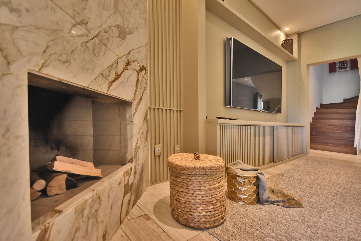 O projeto da lareira empregou o Mármore Matarazzo, conhecido por seus veios marcantes e duráveis. Por aqui, a inserção desse tipo específico de mármore conferiu um centro de atenção à sala de estar, enriquecendo-a com uma presença estilosa e audaciosa.