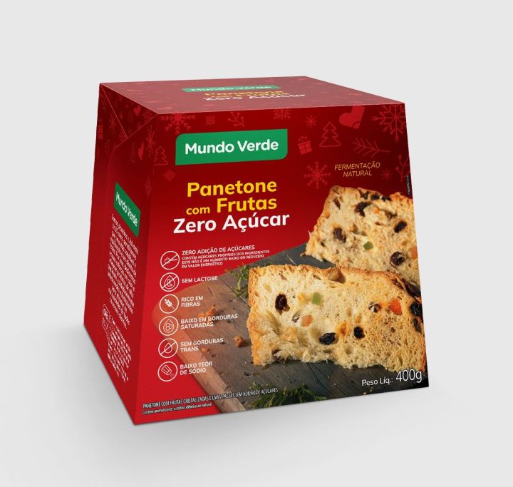 O Mundo Verde traz os Panetones com frutas zero açúcar em dois tamanhos. Eles são preparados a partir de fermentação natural, garantindo sua massa leve. Sem adição de açúcares e sem lactose, a novidade é uma opção ideal para pessoas diabéticas ou com restrição ao consumo de açúcares, além de ser uma opção sem gorduras trans e baixo em sódio. O produto é rico em fibras e combina frutas secas e uvas passas para o sabor tão esperado no Natal.