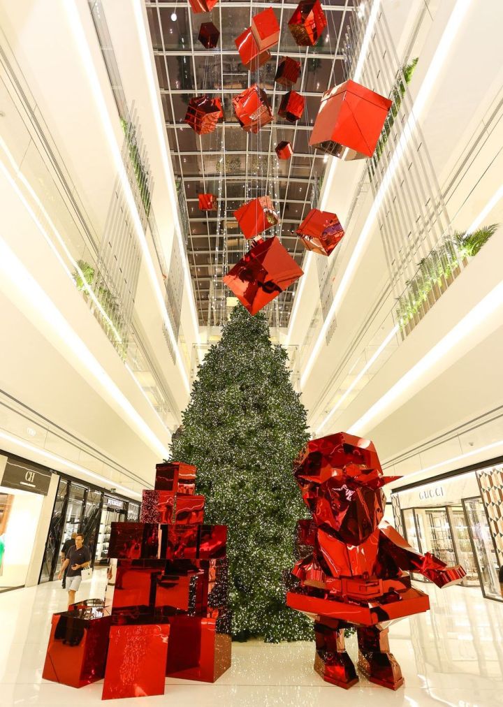 A decoração do Natal 2023 do JK Iguatemi conta com mais de 15 árvores de Natal distribuídas pelo shopping, além da máster no piso térreo com 10m de altura ao lado de caixas de presentes em acrílico vermelho.