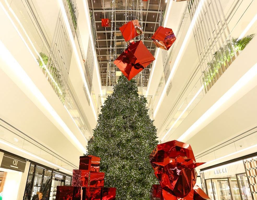 A decoração do Natal 2023 do JK Iguatemi conta com mais de 15 árvores de Natal distribuídas pelo shopping, além da máster no piso térreo com 10m de altura ao lado de caixas de presentes em acrílico vermelho.
