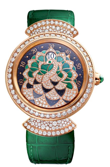 O Divas’ Dream Peacock Mother-of-Pearl Marquetry retrata a silhueta majestosa de um pavão em ouro e madrepérola. Suas penas em forma de leque percorrem o mostrador inferior, enquanto um tufo adorna sua cabeça, complementada por um bico em ouro rosa. Um delicado fundo em madrepérola branca, gravado com raios texturizados, realça o simbolismo múltiplo desta magnífica criatura, que simboliza riqueza, proteção e sabedoria. Detalhes em diamantes evocam um céu estrelado. A criação desta marchetaria em madrepérola exige imenso requinte devido à fragilidade do material. Os elementos em madrepérola são pintados no verso para introduzir vários tons de azul e, em seguida, cortados de forma complexa e inseridos em concavidades esculpidas diretamente no mostrador. Incrustações niveladas, delineadas em ouro rosa, acentuam a iridescência natural da madrepérola, este considerado o presente mais precioso do mar.